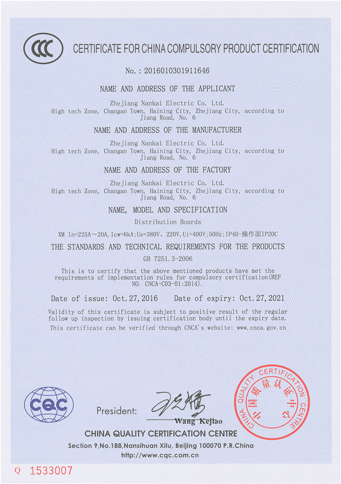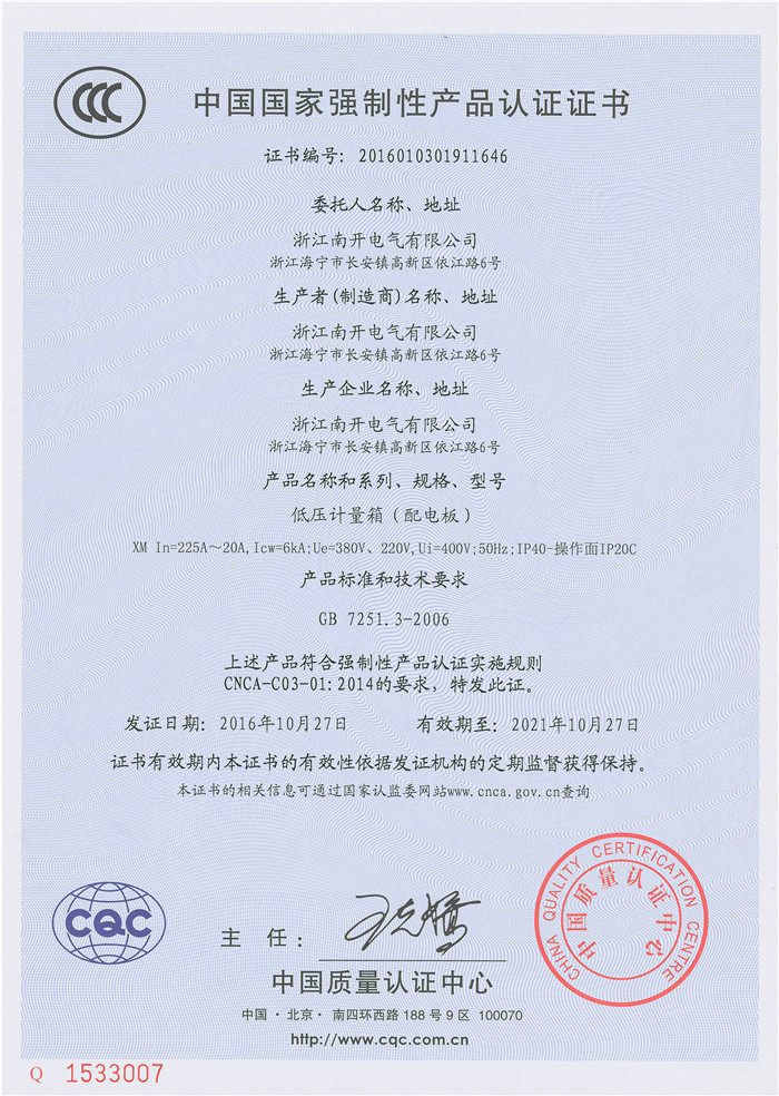 XM 225A~20A 3C证书